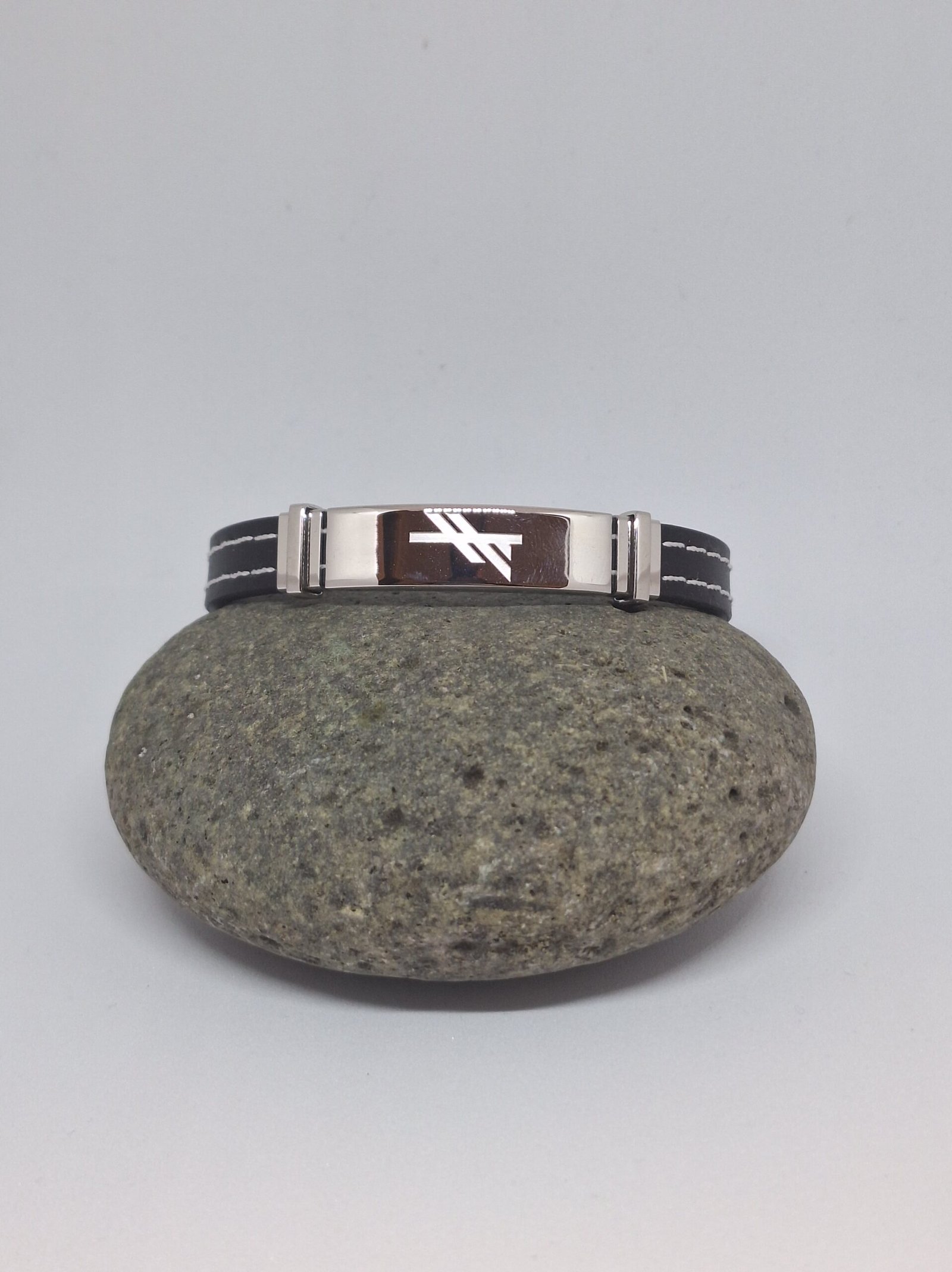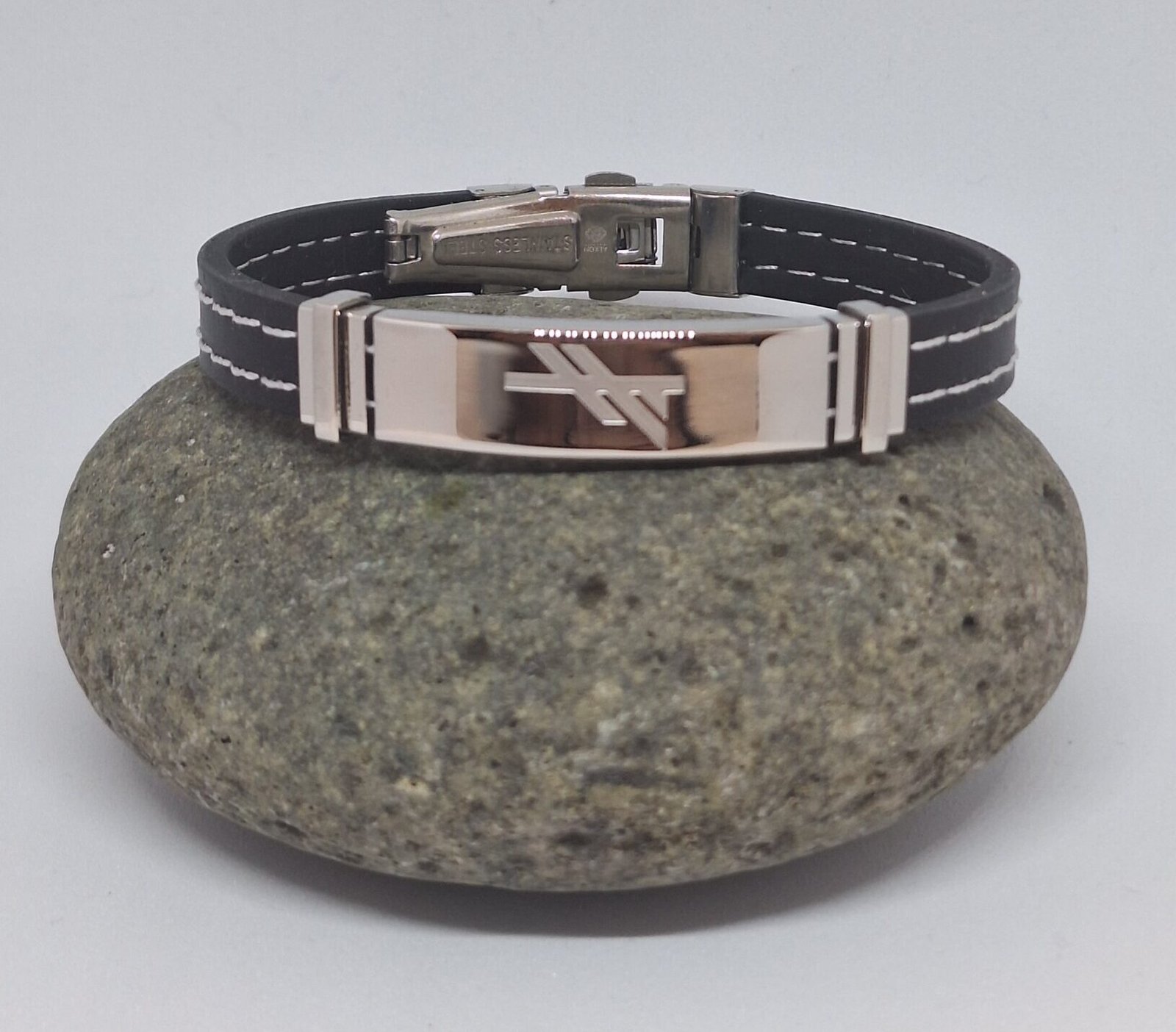 Eydnu bindrúnan er grava í hettar hettar vakra armbandi, ið hevur ein plátu úr rustfríðum stáli við lás og eini gummi reim ið kann styttast um tað er brúk fyri tí.