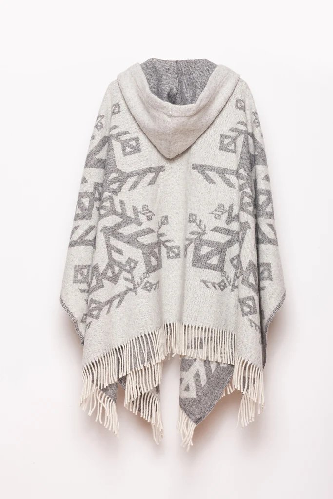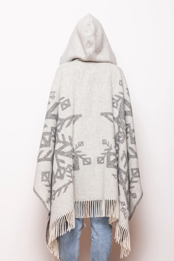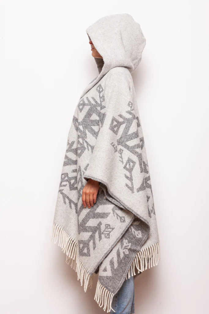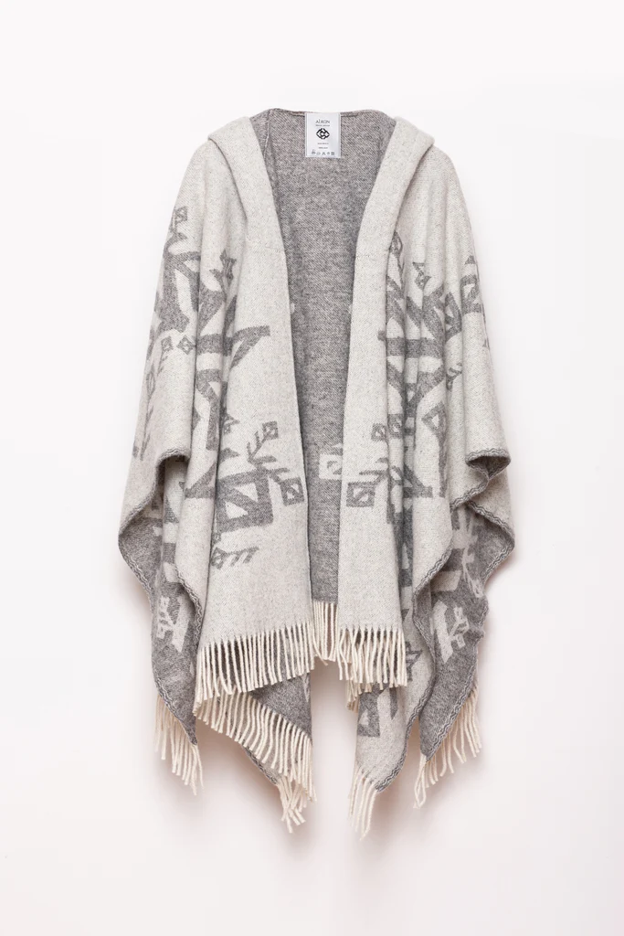 Vovið ú 100% há-góðsku Nýsælandskari ull, hesin ljósa grái ull møtilin vísur fram symbolskar rúnu-kveikjandi mynstur ið ímynda tær mest hjartaligu kenslurnar – kærleika, trúfesti og ovurhuga (Passion).