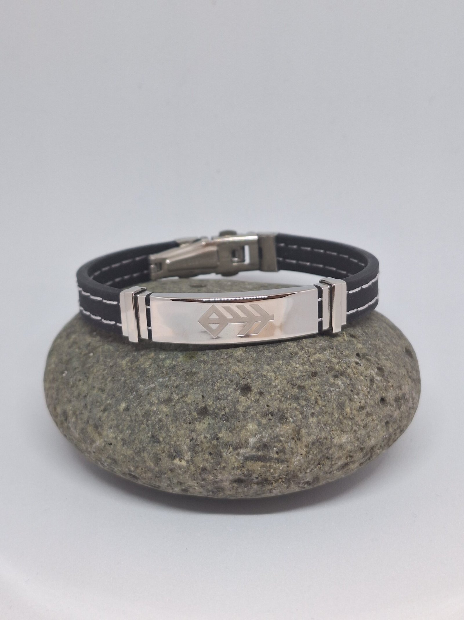 Tónleika bindrúnan er grava í hettar hettar vakra armbandi, ið hevur ein plátu úr rustfríðum stáli við lás og eini gummi reim ið kann styttast um tað er brúk fyri tí.